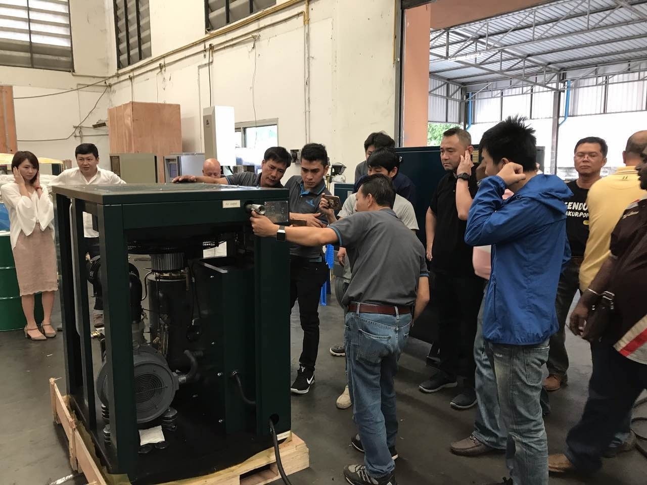 在理論知識(shí)培訓(xùn)后,隨后的培訓(xùn)安排在泰國(guó)開(kāi)山的廠(chǎng)房和車(chē)間內(nèi)進(jìn)行,現(xiàn)場(chǎng)開(kāi)放了四個(gè)系列的8余個(gè)機(jī)型供代理商了解,開(kāi)山公司員工分4批分別給各代理商服務(wù)人員進(jìn)行現(xiàn)場(chǎng)交流和答疑。