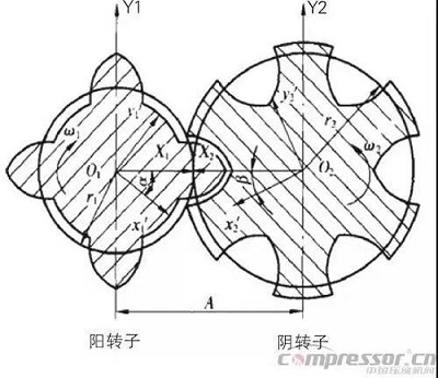 螺桿壓縮機(jī)轉(zhuǎn)子齒面主要用于壓縮氣體,由陰、陽(yáng)兩根轉(zhuǎn)子的齒槽相互嚙合構(gòu)成多個(gè)工作腔。對(duì)于工藝螺桿壓縮機(jī)和干式無(wú)油螺桿壓縮機(jī),其中的陰、陽(yáng)轉(zhuǎn)子工作過(guò)程中并不直接觸摸,兩轉(zhuǎn)子間的動(dòng)力傳遞是經(jīng)過(guò)同步齒輪進(jìn)行的。螺桿轉(zhuǎn)子端面齒形除滿足共軛嚙合和便于加工外,還必須具有小的泄漏三角形和較大的面積利用系數(shù)以及較高的容積效率等。所以,螺桿壓縮機(jī)的轉(zhuǎn)子型線主要由直線、擺線、圓弧、橢圓及拋物線等多段曲線首尾相切組成。螺桿壓縮機(jī)最重要的是轉(zhuǎn)子端面型線,轉(zhuǎn)子型線的好壞決定了螺桿壓縮機(jī)性能的優(yōu)劣。
