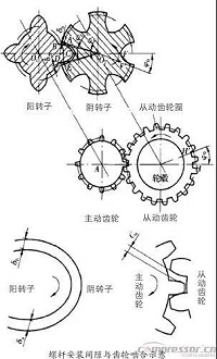 工藝螺桿壓縮機(jī)和干式無(wú)油螺桿壓縮機(jī)嚙合間隙靠同步齒輪進(jìn)行控制。同步齒輪的主動(dòng)、從動(dòng)齒輪與其對(duì)應(yīng)的為陽(yáng)、陰轉(zhuǎn)子具有相同的節(jié)圓。因?yàn)橹鲃?dòng)齒輪與陽(yáng)轉(zhuǎn)子是靠鍵連接的,可將它們看作一個(gè)整體齒輪。然而從動(dòng)主齒圈及背隙齒圈都套在輪轂上,當(dāng)輪轂與陰轉(zhuǎn)子通過(guò)鍵連接好后,兩齒圈相對(duì)于輪轂及陰轉(zhuǎn)子仍具有可調(diào)性。